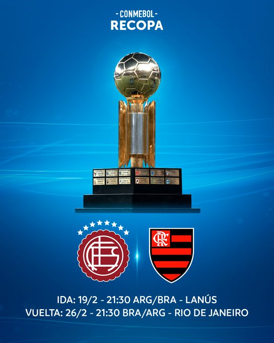 A Conmebol as datas e horários para a disputa da Recopa Sul-Americana de 2026. O confronto será entre Flamengo, campeão da Libertadores, e o Lanús, equipe argentina campeã da Copa Sul-Americana, com encontros no dia 19 e 26 de fevereiro, e decisão dentro do Maracanã.