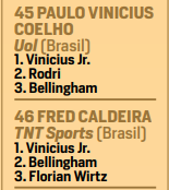 Meus indicados seriam jogadores do Real Madrid. Vinicius Jr, não pelo que fez pelo Brasil, mas pelo Real Madrid, me parece um grande atacante. Jude Bellingham, destaque da Inglaterra na Eurocopa e com atuação notável no Real Madrid, impressiona em sua adaptação. E o Federico Valverde tem um trabalho menos impressionante, mas é regular no Real Madrid, foi o jogador com mais assistências e sempre vencendo, mesmo na seleção uruguaia assumiu a capitania e teve uma grande reviravolta na última temporada.